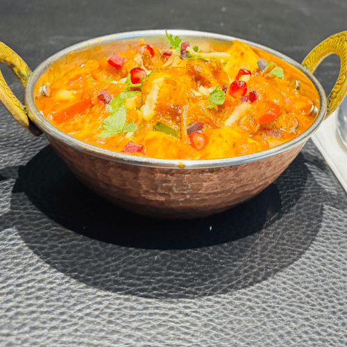 Indian cheese baked in a tandoor, served in a sauce of yoghurt, cream, cashew nuts and methi leaves.
